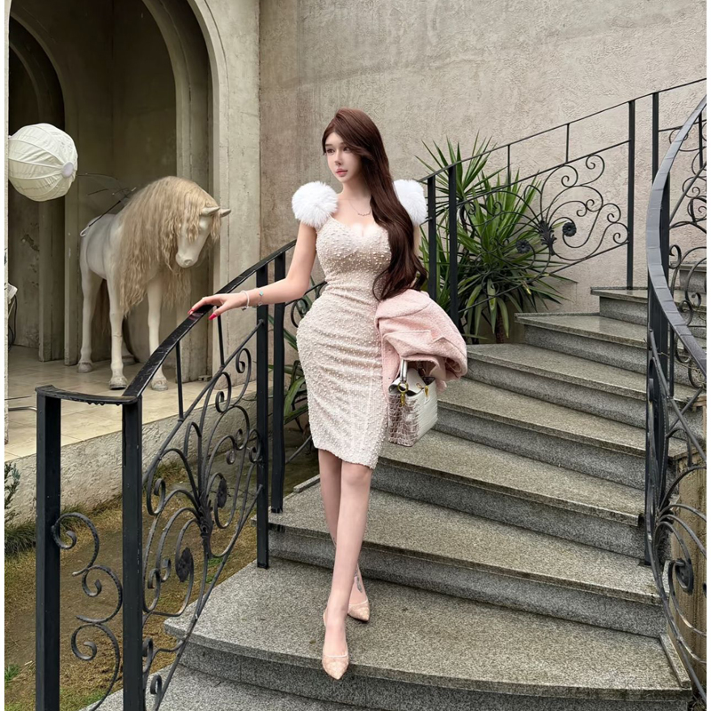 Qianjin Feng furry heavy industry conglomerate pearl dress little princess furry shoulder fashionable small dress enchanting