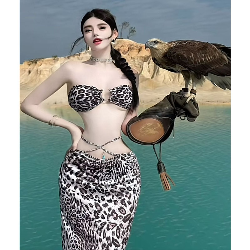 Hot girl sexy chest wrapped vacation beach INS anchor strapless beach temptation slim half skirt leopard print set