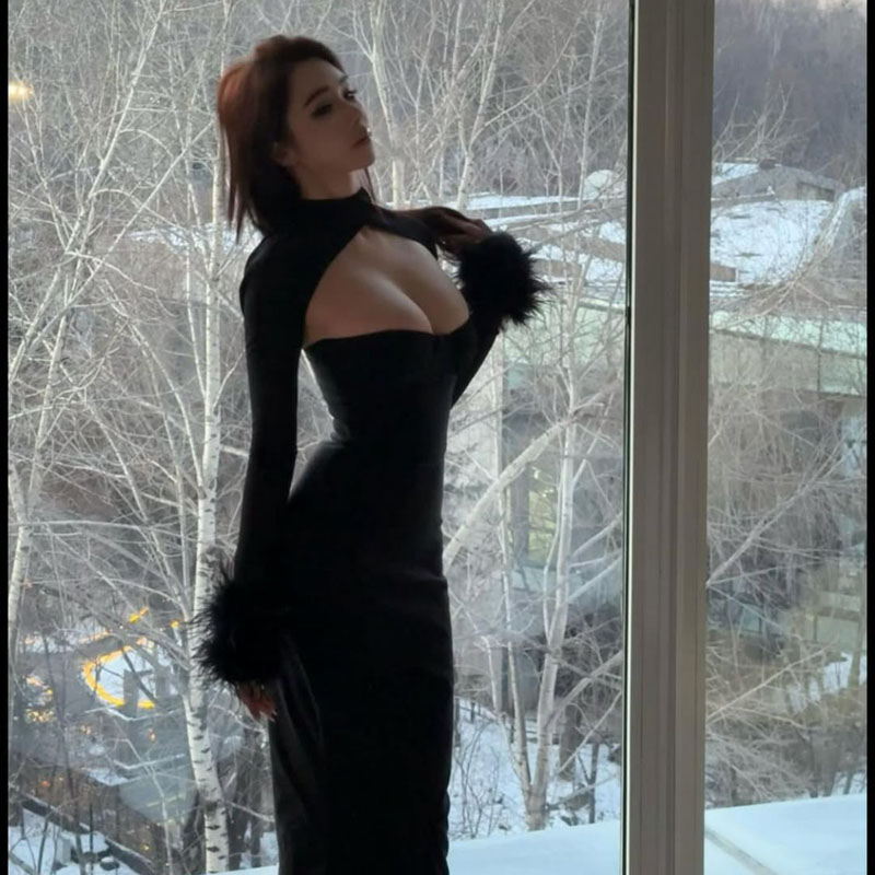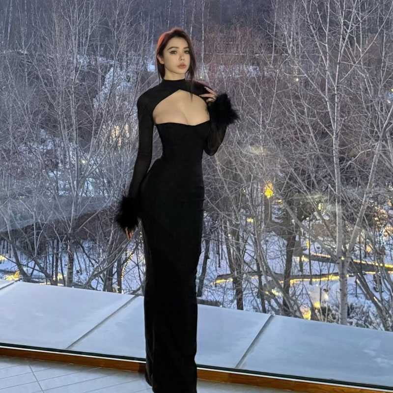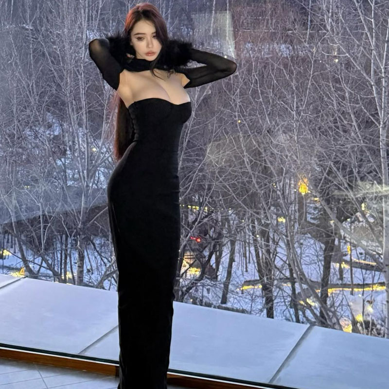 Royal sister hairy sleeve mesh sexy hottie black tube top dress French dress slim fit sexy halter dress
