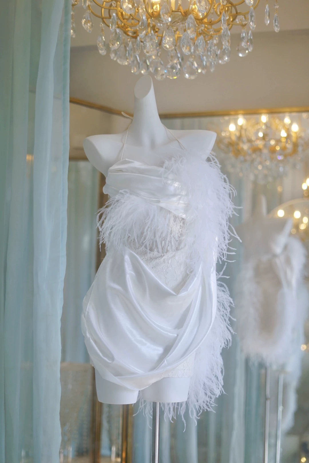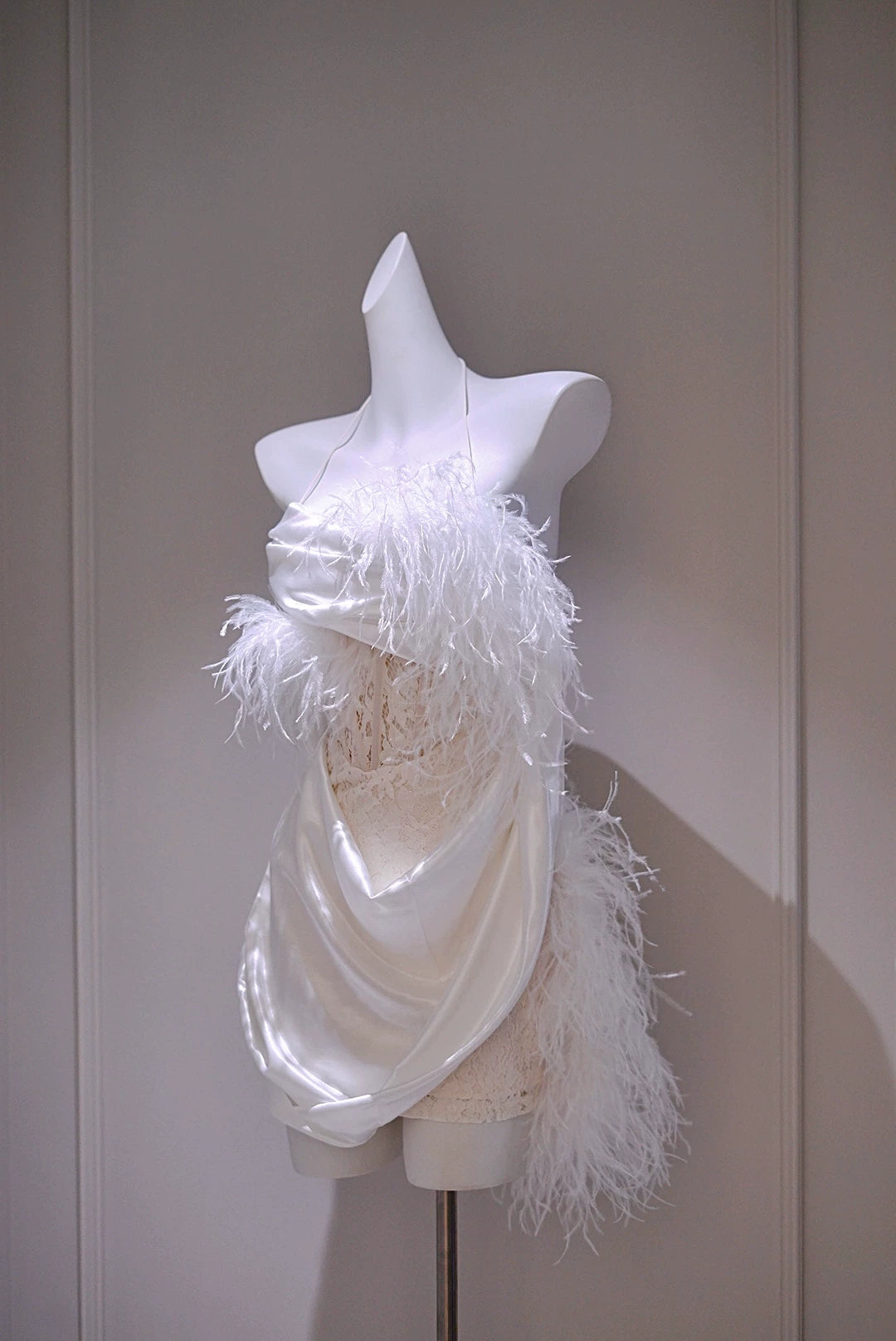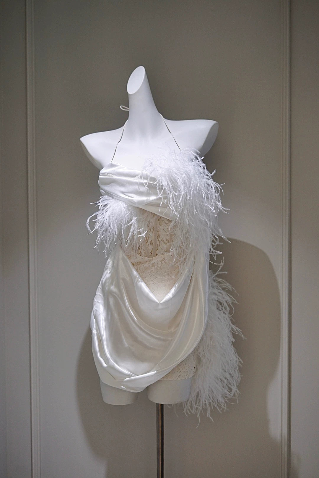 Ostrich hair acetic acid satin neck lace French fairy evening dress dress