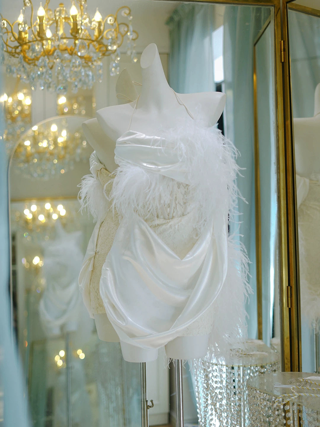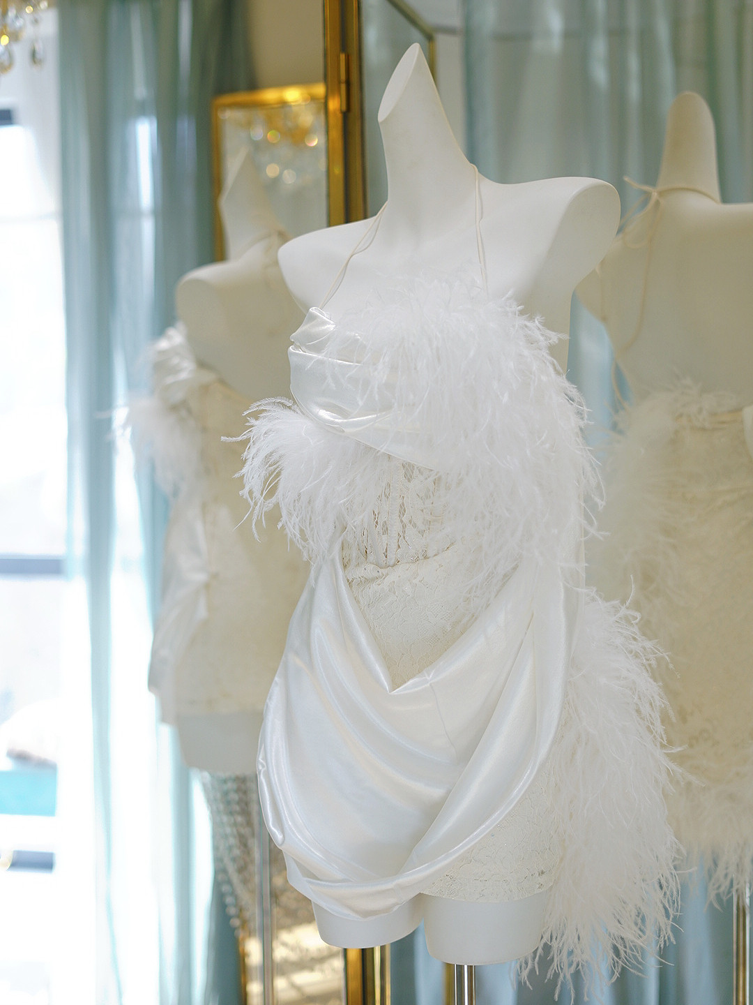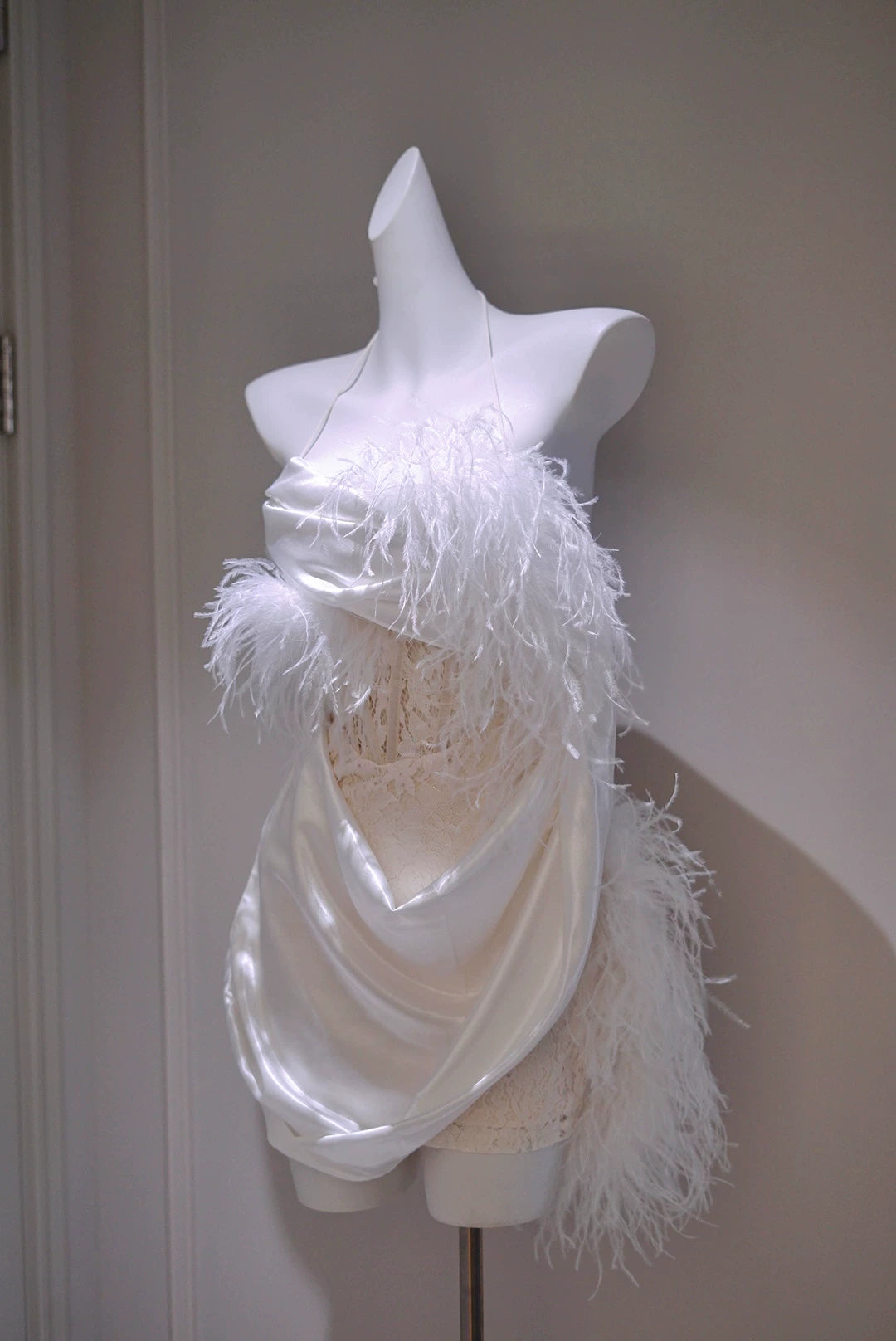 Ostrich hair acetic acid satin neck lace French fairy evening dress dress