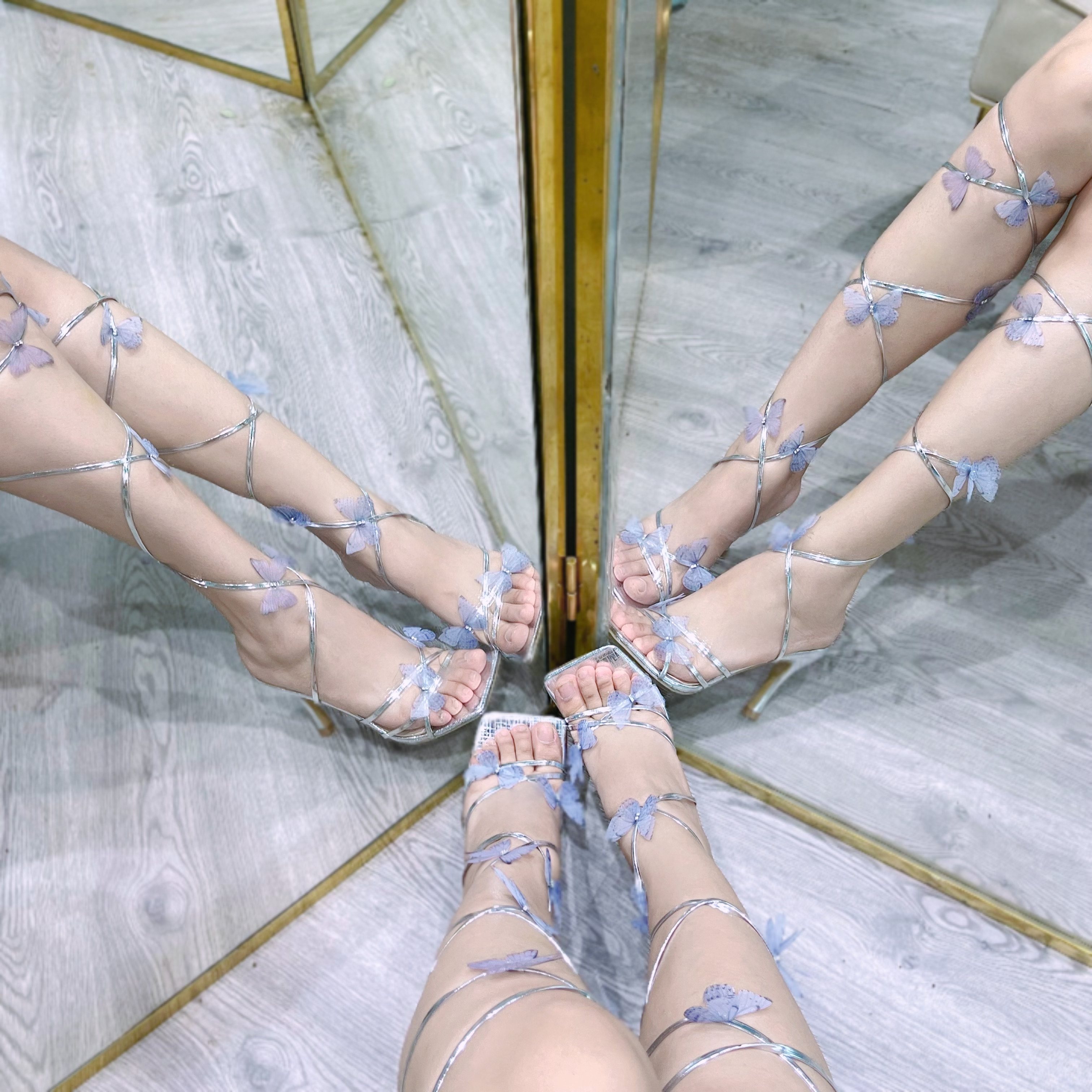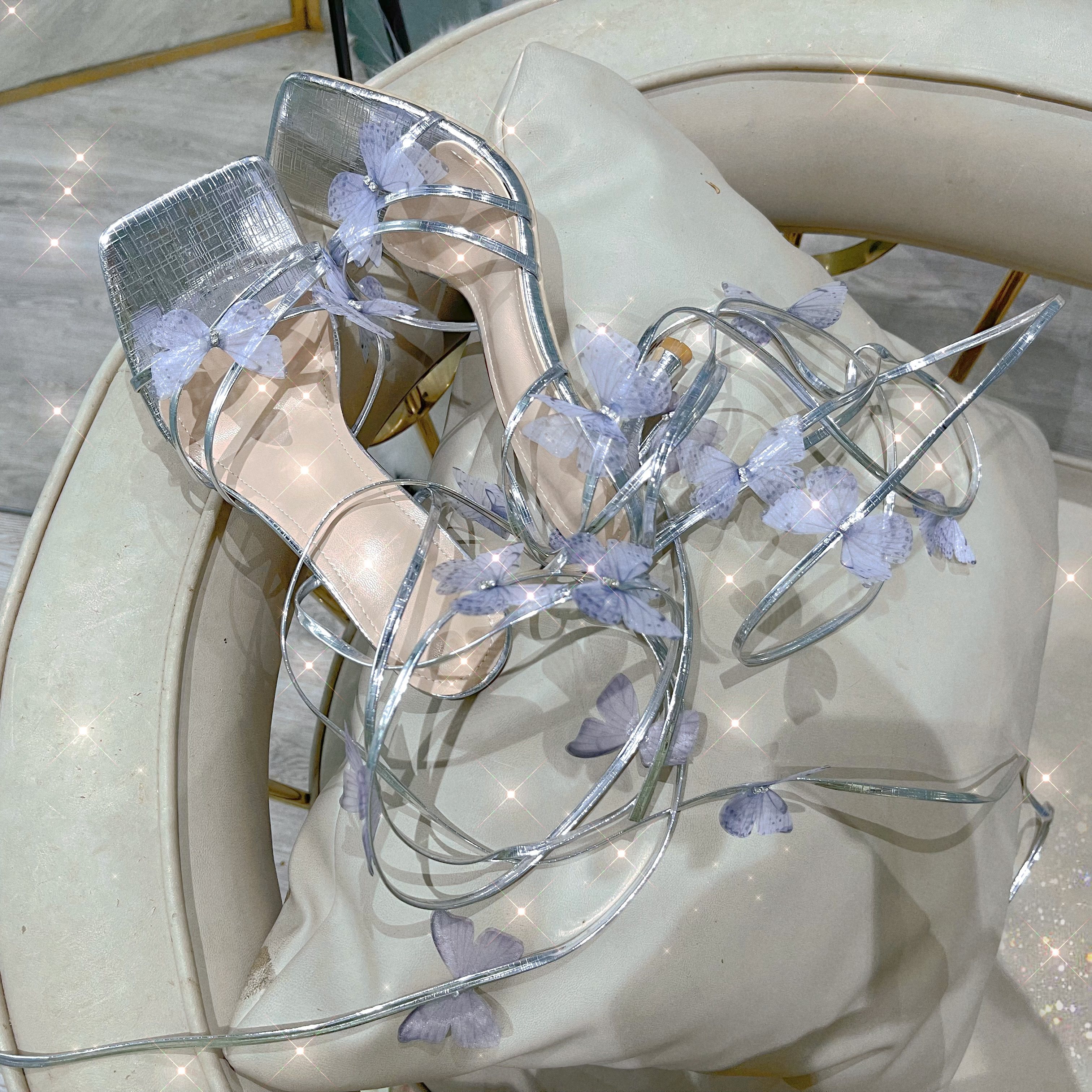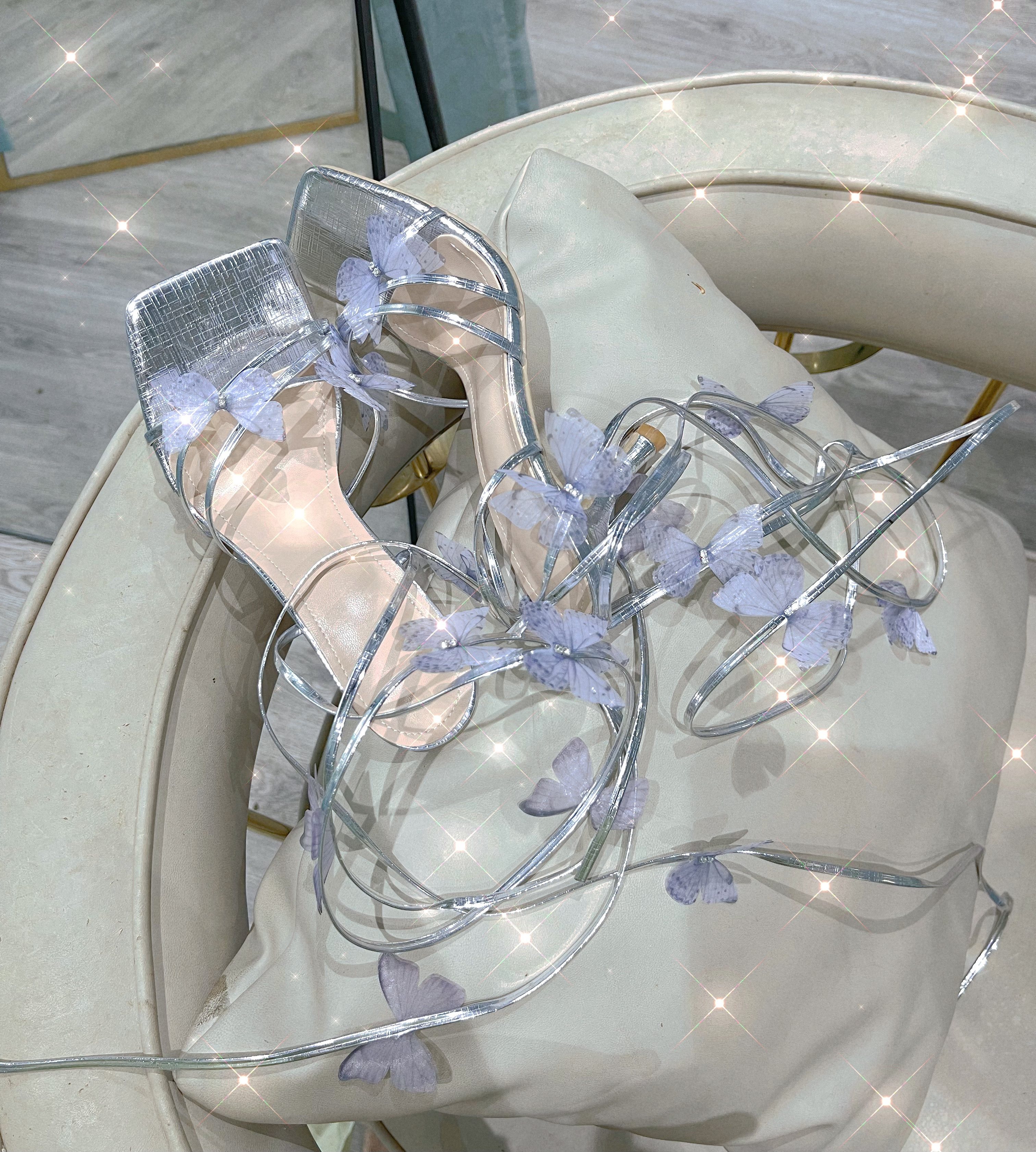 Handmade custom blue moon stone | three-dimensional butterfly strap silver silk open-toed stiletto fairy temperament high heels sandals