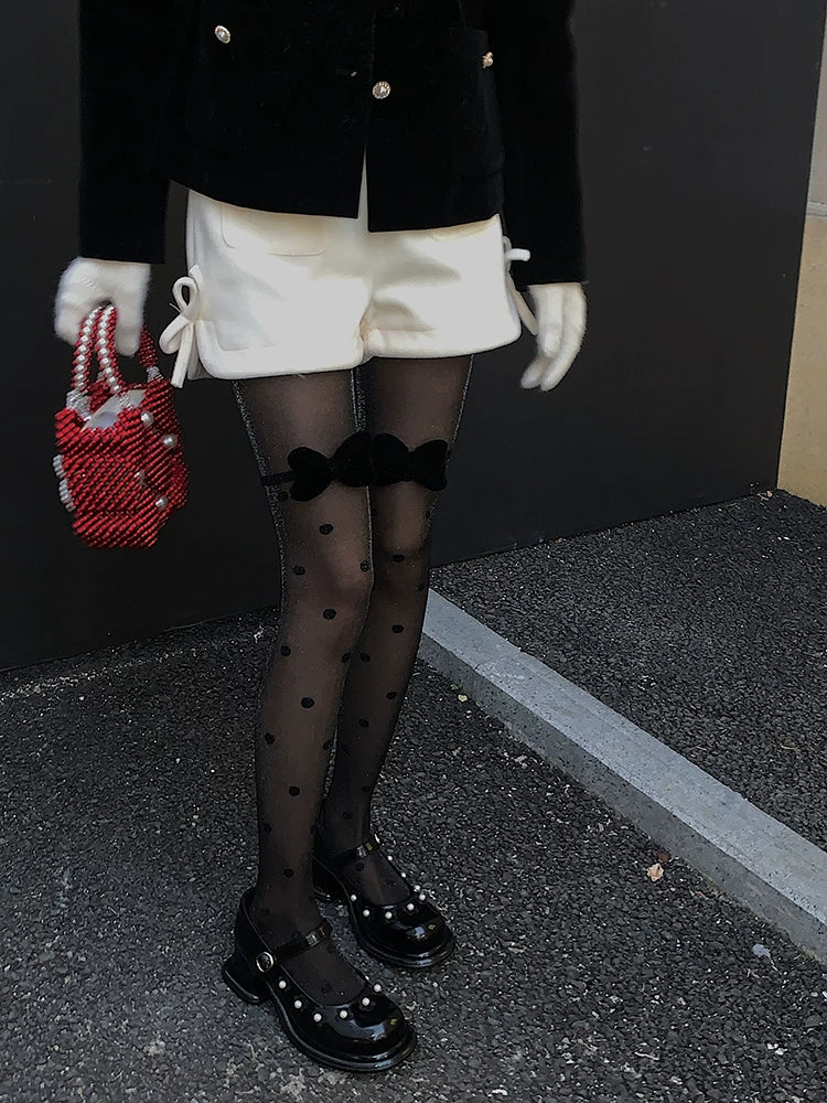Fashion original niche design pearlescent polka dot black stockings girl bow versatile bare leg socks artifact