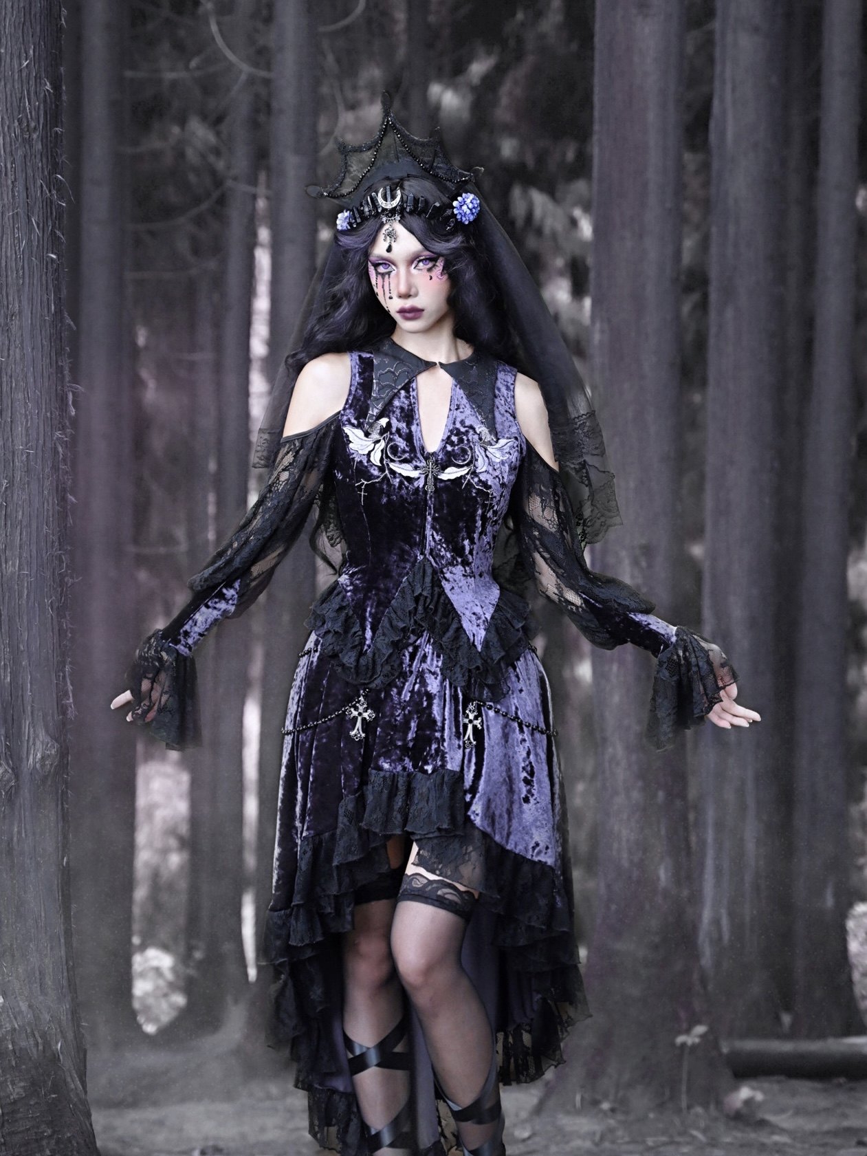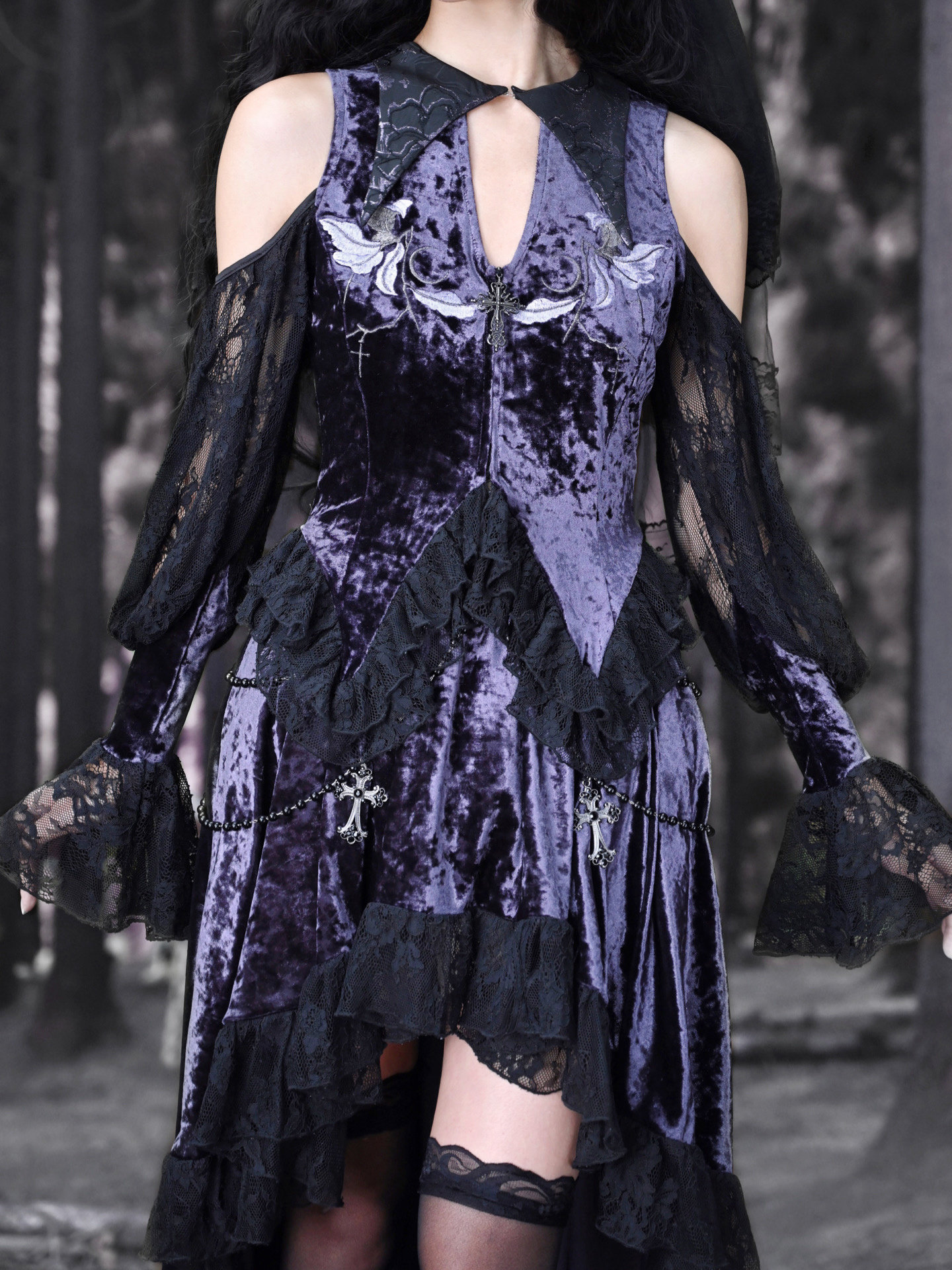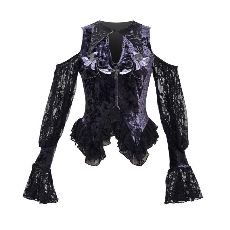 Luna Ritual Velvet Ambience Embroidery Tip Neck Lace Flared Sleeve Top Christmas