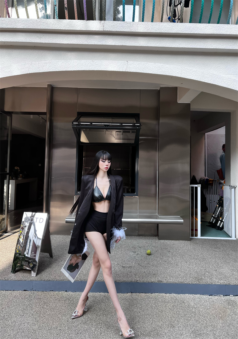 French celebrity style ostrich fluffy blazer medium and long women's spring and autumn high-end feeling thin and sexy black coat